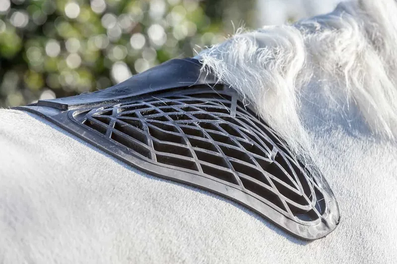 The ‘Front Riser’ is particularly suited to horses with high withers or that have lost muscle and bulk at the top of the shoulder and below the wither. The pad has minimal depth over the centre so doesn’t increase pressure under the pommel. However, its unique honeycomb structure ensures the main weight bearing areas are compensated. Traditional ÷wedge style’ risers that taper to the back of the saddle often pivot on the wither & spine increasing pressure under the front of the saddle as well as causing an unwanted ‘rise’ in the whole saddle.