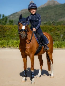 At last a premium designer collection for Kids! Mini LeMieux is intended to appeal to the under twelves with an eye for style. Designed particularly for 11.2hh to 13hh ponies, the Mini LeMieux Fly Hood is hand made from two styles of close-knit crochet with comfortable high-density fabric ears that soften sound. Suede embroidered detailing and colour matched braid complete the range.