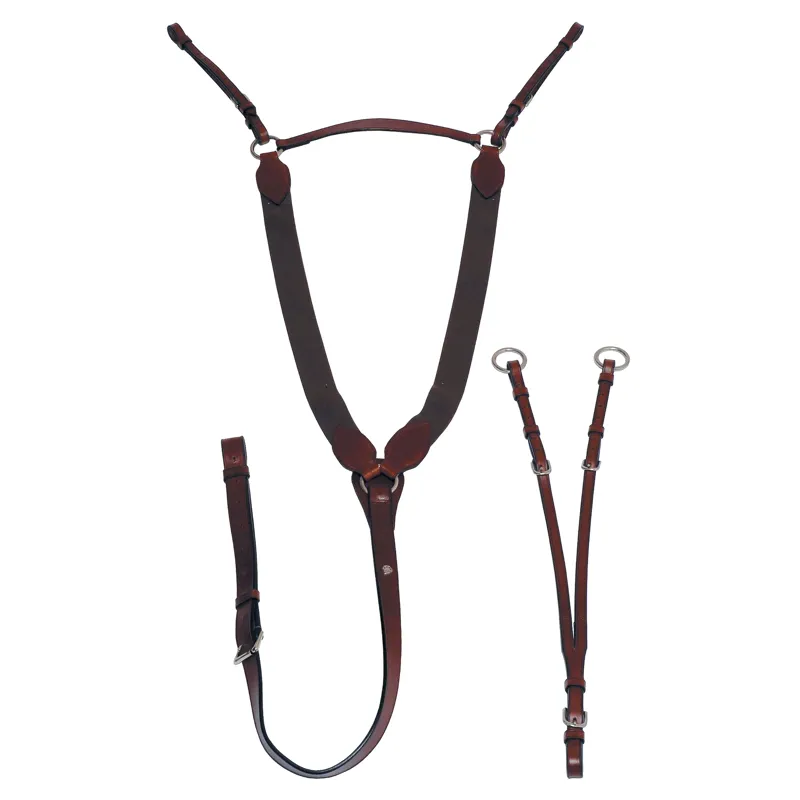 The Mark Todd V-Check Breastplate is made from soft and supple leather with stainless steel fittings and adjustable martingale attachment.