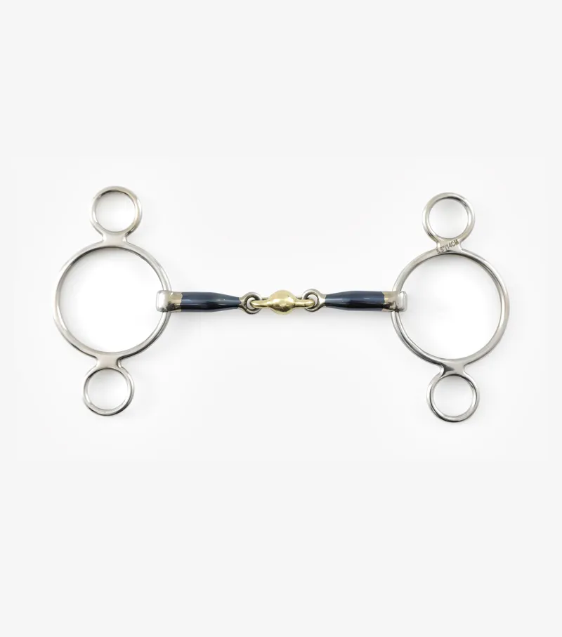 An anatomical brass alloy lozenge in the centre helps to distribute even pressure over both the tongue and bars of the mouth and also encourages mouthing and contact. The blue sweet iron mouthpiece oxidises easily which creates a warming sensation and a sweet taste in the horse’s mouth, helping them to accept the bit. Please note that the blue colour will fade with use, this is normal. An ideal bit for those that need some extra braking power when jumping or doing fast work.