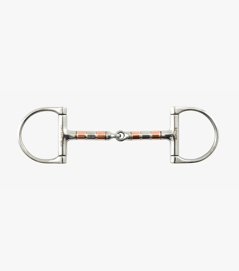 The copper roller mouth dee bit is useful for horses that tend to fix or try and grab/lean on the bit. The alternating copper and stainless steel rollers set along the mouthpiece enable the bit to move in the horse’s mouth preventing them from grabbing or leaning on the bit. The single jointed mouthpiece has a nutcracker action applying pressure on the lips and bars of the mouth. The dee ring cheeks can aid with steering, backing up the aids when the rider asks for a turn.