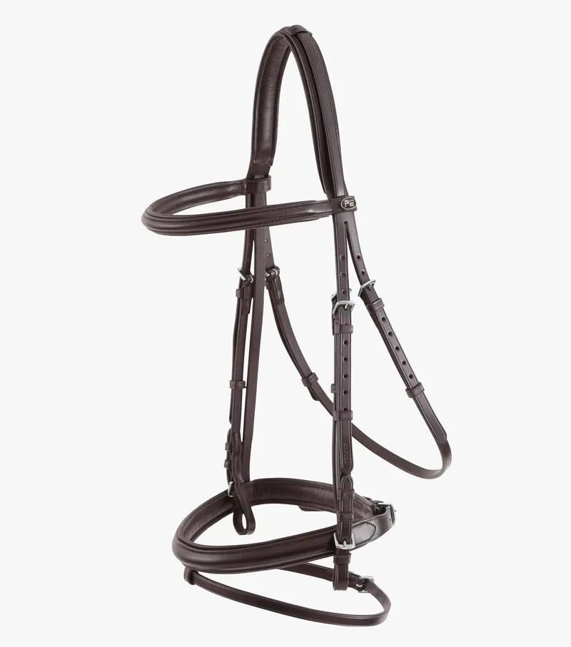 A delectably soft snaffle bridle crafted from Italian leather which will look the part in any equestrian discipline. The padded poll piece enhances comfort and the noseband is secured over the top, ensuring an even pressure is applied for heightened performance. A beautifully soft, padded browband with a round raised design sits neatly at the front, emphasised either side by two luxury ‘PE’ branded brooches.