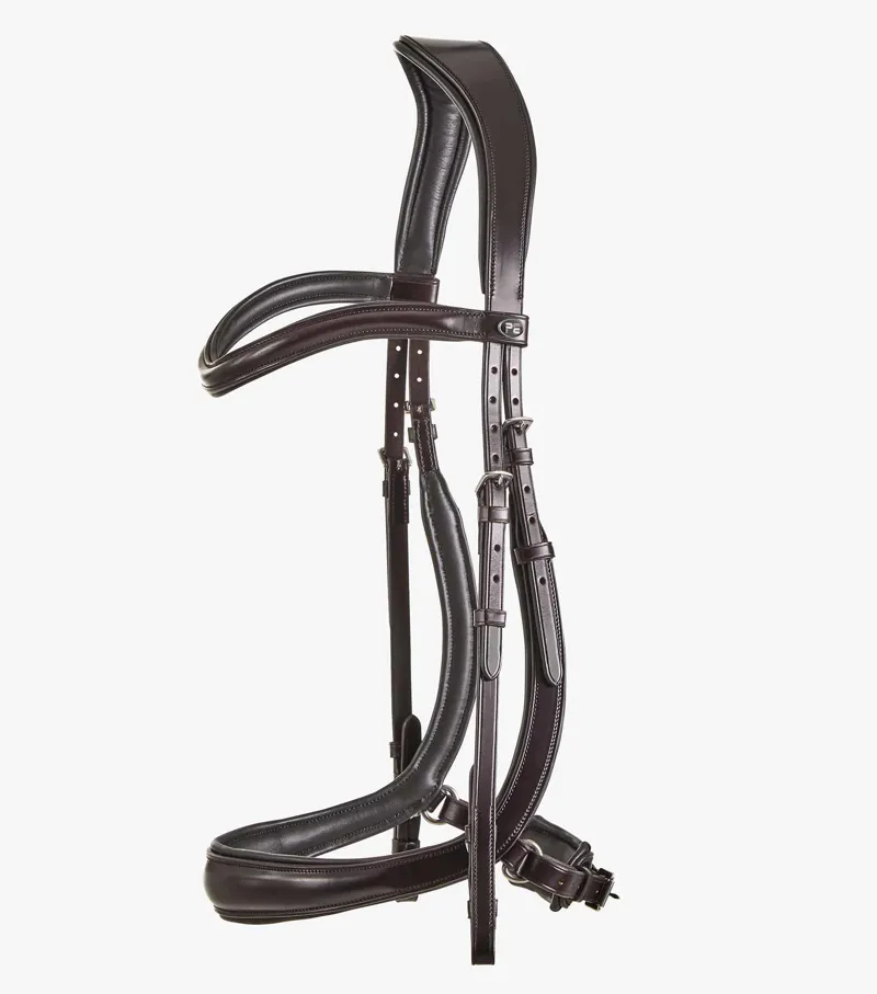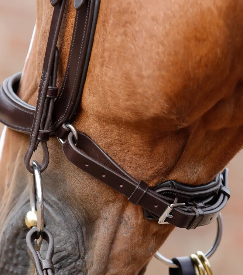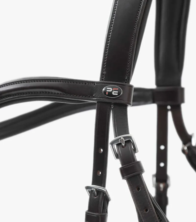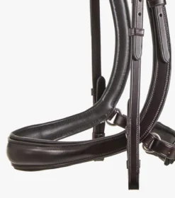 The anatomically shaped, padded poll piece has been carefully designed to distribute pressure over the less sensitive areas of the poll and away from the ears. A padded, shaped browband creates definition and the round raised design offers an elegant aesthetic. Our anatomically shaped snaffle noseband dips down to avoid contact with the horse’s cheekbones, alleviating pressure and potentially heightening performance.