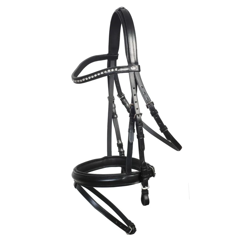 A plain design meets sparkling crystals: NEO LINE bridle BERLIN with a flashnoseband focuses skilfully on the slightly curved browband with big, roundcrystals. As a perfect companion in a rider’s everyday life, BERLINfeatures with durable leather in high quality.