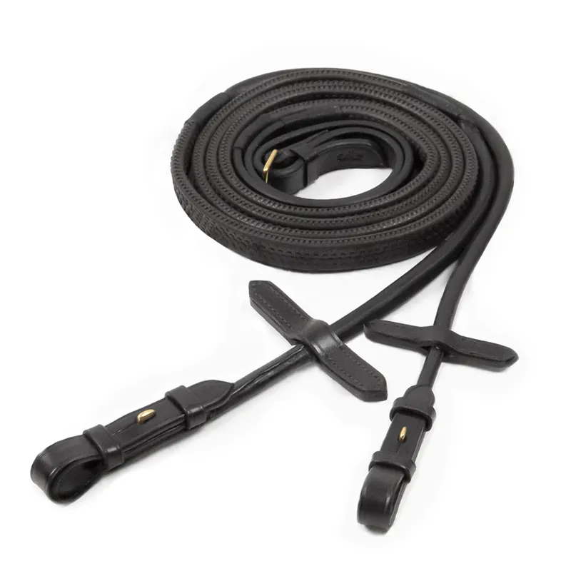 Elegant RUBBER REINS with rolled leather ends and hook and stud closures. The reins are made out of a 17mm wide rubber material and equipped with rein stops for the safe use of a martingale.