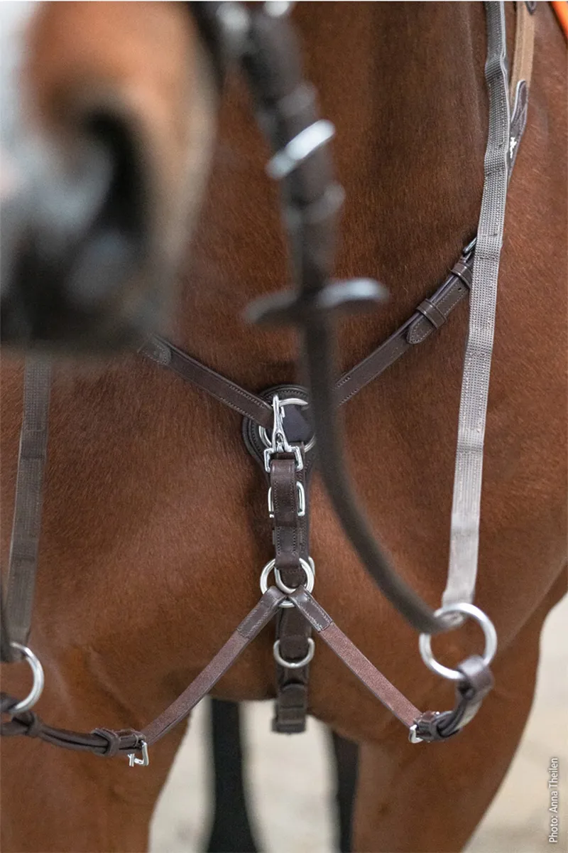 Modern breastplate matching to the Select & Mix range by SchockemoehleSports. It´s easy to fix the sides in saddle straps. Thanks to the usefulsnap hooks, the breastplate can be applied in just a few steps. Elasticside parts und softly padded rings offers more comfort. The bridge can beadjusted individually and the fork is easy to remove by snap hook. Due to the various adjustments the breastplate can be fitted perfectly to thehorses anatomic.